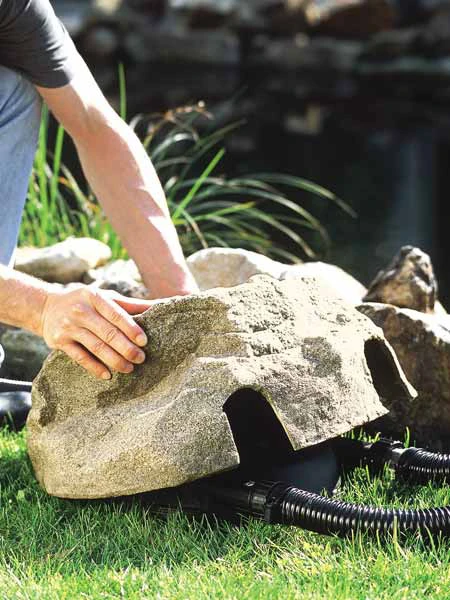 Die witterungsbestĂ€ndige Abdeckung (57 x 57 x 32 cm) aus hochwertigem, stabilem Kunststoff in attraktivem, sandstein-Felsdekor schĂŒtzt die AnschlĂŒsse im Deckelbereich des Filters und passt sich durch die natĂŒrliche OberflĂ€chengestaltung harmonisch in die Teich- bzw. Gartenlandschaft ein.