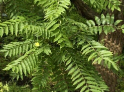 | Blatt, Holz: | Die frischgrünen Blätter sind paarig gefiedert und ohne Nebenblätter. Rauher, rissiger Stamm, innere Rinde fleischrot und nach Knoblauch/Pfeffer duftend. Holz weisslich. |