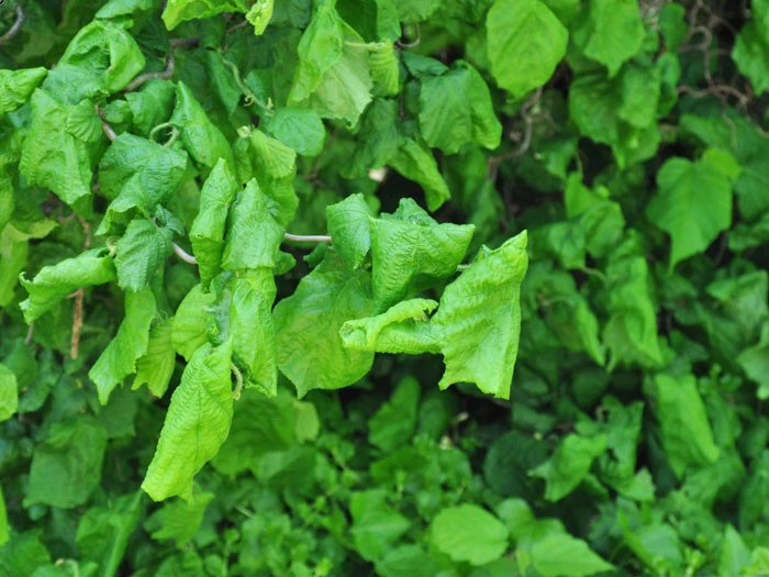 | Blatt, Holz: | Blatt breitrund, teilweise krĂ€uselig eingerollt. Zweige korkenzieherartig gedreht. SommergrĂŒn, im Winter blattlos. |