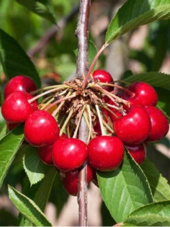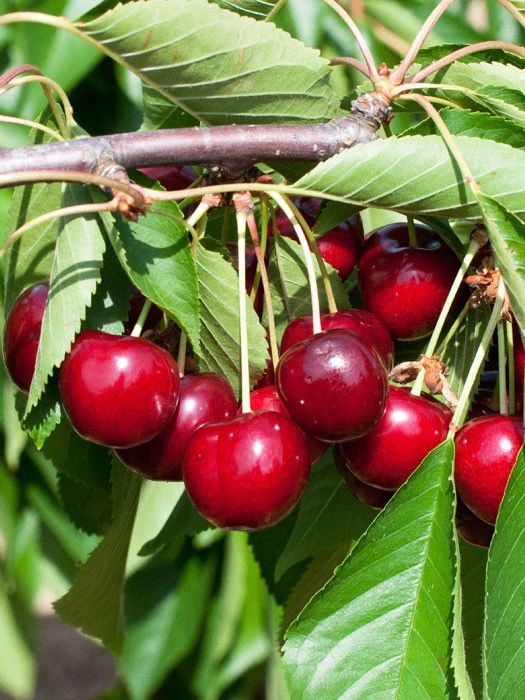 | Frucht: | Burlat: GroĂ bis sehr groĂ; leuchtendrot bis dunkelrot; Fleisch fest, saftig, sĂŒĂ mit gutem Aroma, Saft hellfarbig. Sunburst: sehr grosse, breitrunde FrĂŒchte mit purpurroter, leicht streifiger Schale. Fruchtfleisch mittelfest und saftig. |