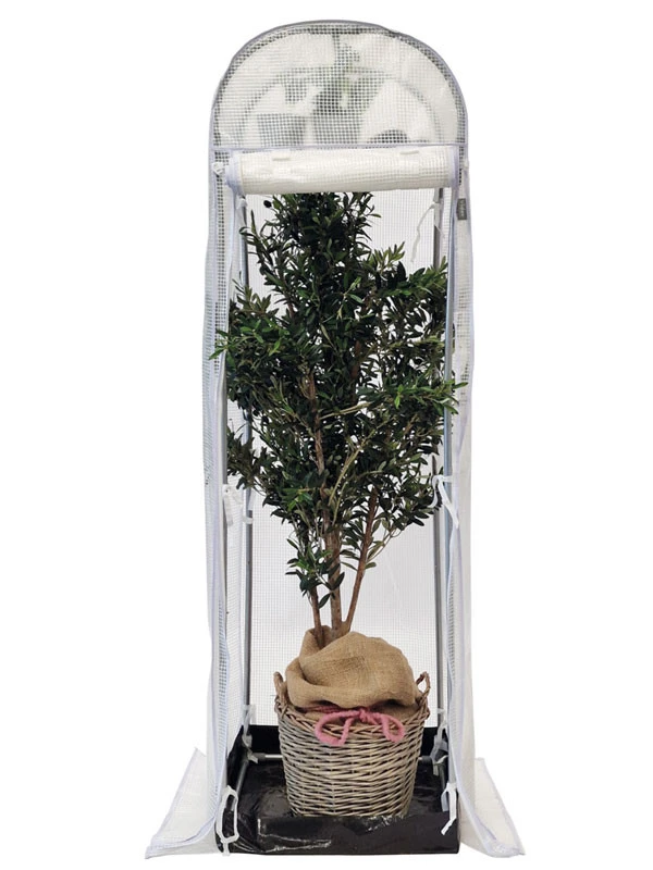 Balkonpflanzen platzsparend im Außenbereich überwintern, mit dem Videx Frost-Schutzhaus SNOW. Das mobile Balkon-Frostschutzhaus ist schnell auf dem Balkon, im Hof, oder der Terrasse aufgebaut. Das stabile, pulverbeschichtete Metallgestänge kann sehr leicht zusammengesteckt werden. Die lichtdurchlässige Gitterfolie schützt Balkonpflanzen vor Schnee, Nässe, Wind und leichtem Frost. Im Sommer ist das Zelt auch als Anzuchthaus für Gemüse und Stecklinge für Blumen zu verwenden. Ein zusätzlicher Metallboden schafft Ablagefläche für kleine Töpfe. Die separate Bodenplane ist rundum über Klettverschlüsse fixiert.