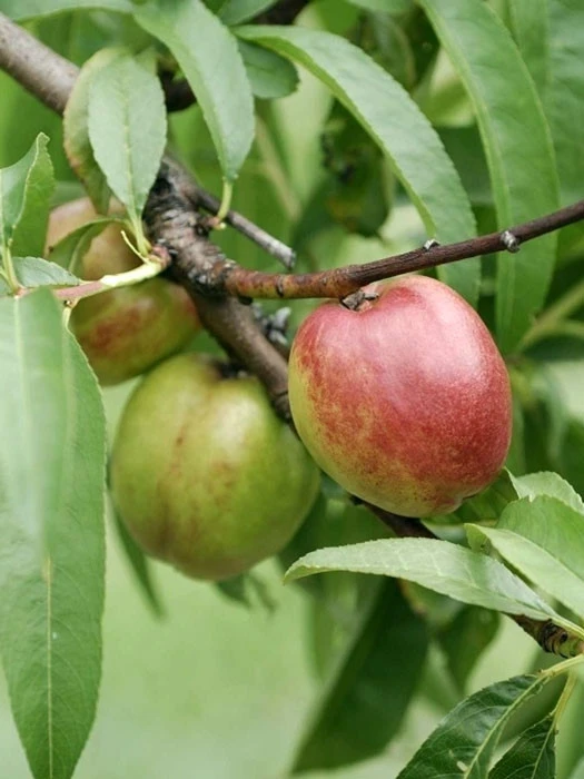 | Frucht: | Goldgelb-fleischig. Glatte Aussenhaut, gelb mit roter Färbung. Gross, aromatisch, süss und saftig. |