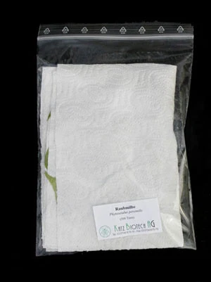 ♦ geliefert werden lebende Raubmilben und deren Eier auf Bohnenblättern.