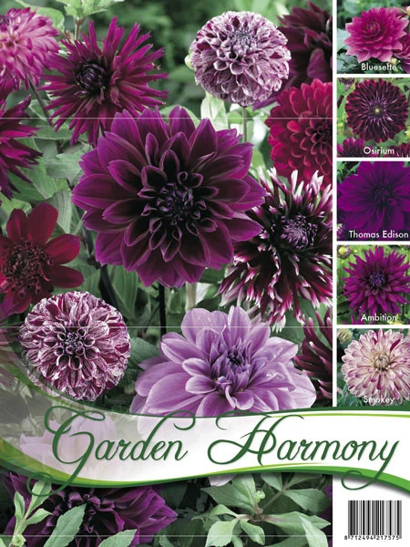 Das Sortiment besteht aus 5 Sorten blauer und lila-farbener Dahlien, die aufeinander abgestimmt sind.
