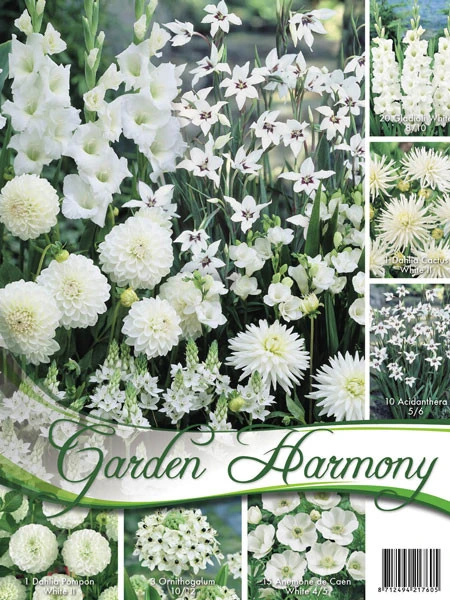 Das Sortiment besteht aus 6 Sorten verschiedener weiß blühender Blumenzwiebelarten, die aufeinander abgestimmt sind.