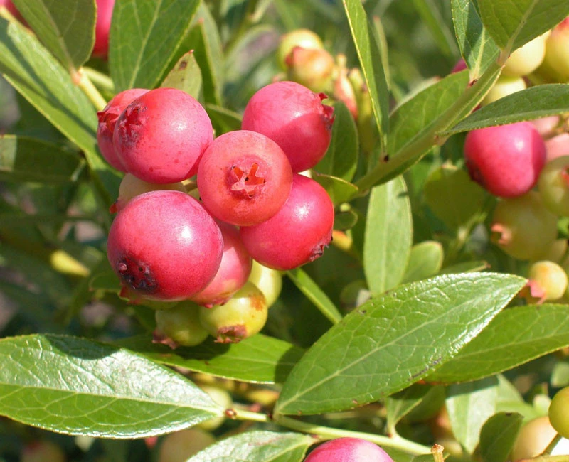 | Frucht: | Groß und fest mit leuchtend pinkfarbenen Heidelbeeren. Sehr süß und knackig. |