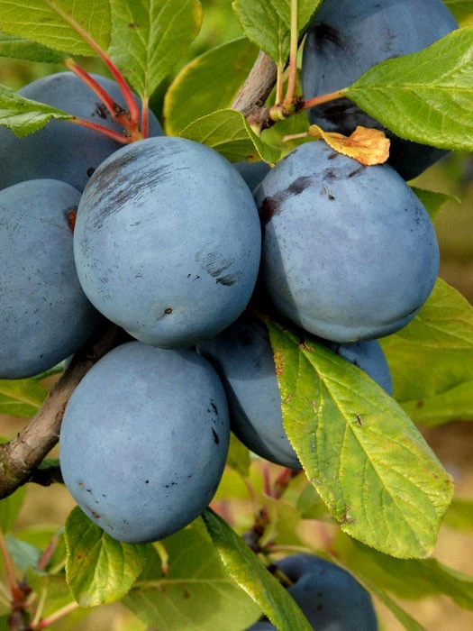 | Frucht: | MittelgroĂ bis groĂ, lĂ€nglich oval; Haut schwarzblau mit hellblauem Reif; Fleisch grĂŒnlichgelb bis goldgelb, fest, sĂŒĂ, saftig, gut steinlösend. |
